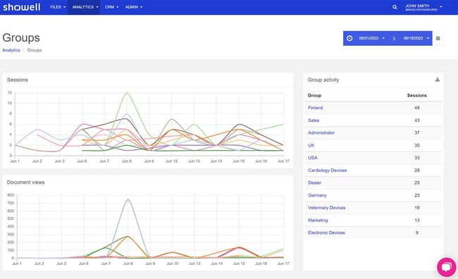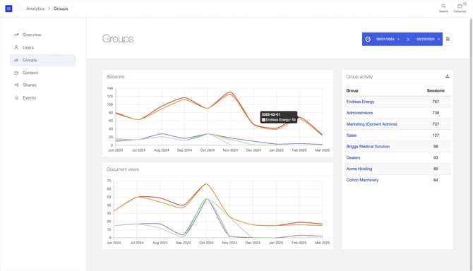 Use Group Analytics to compare different groups to each other and see the number of sessions and document views of each group during your selected time period.