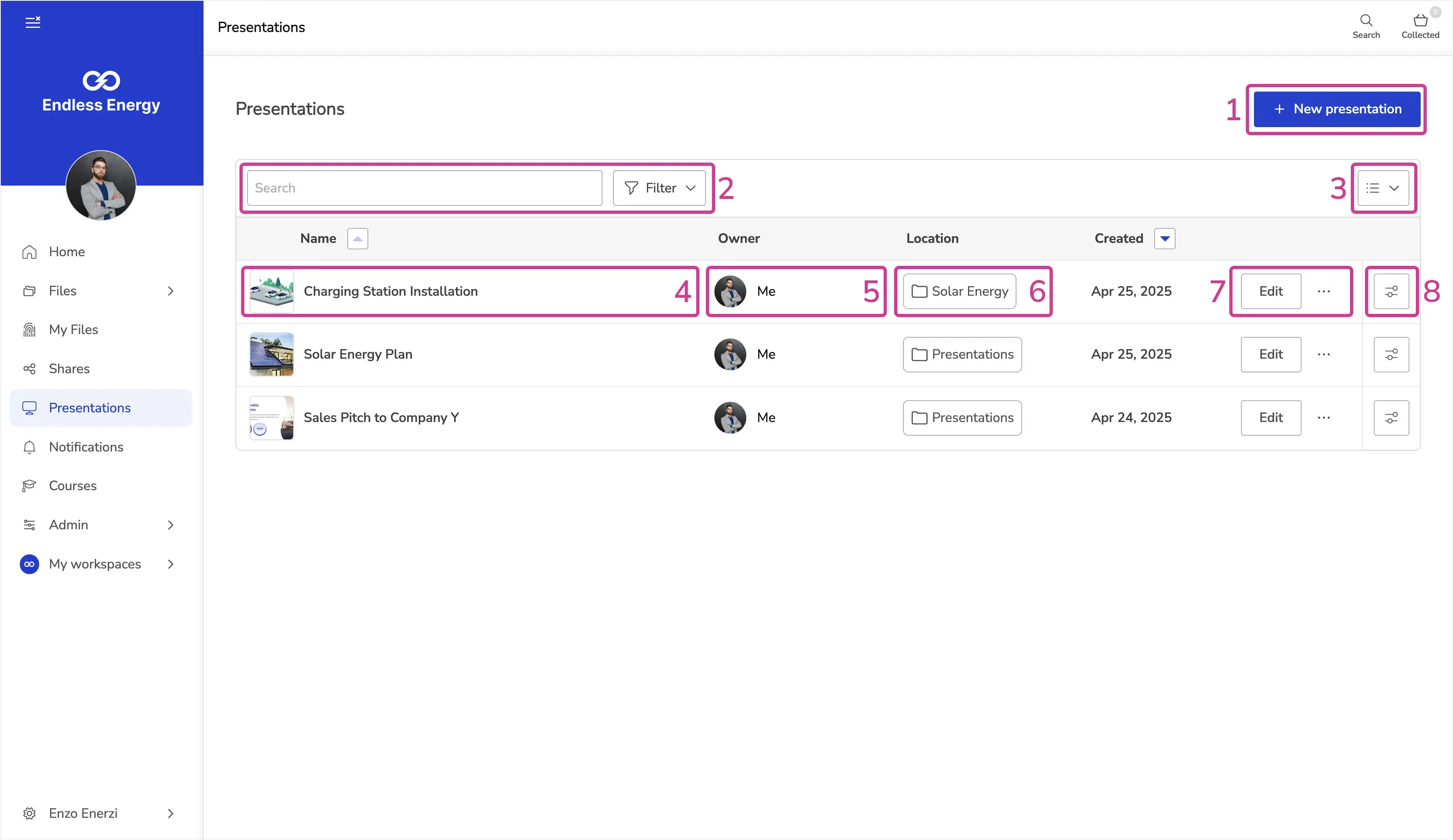 The Filter allows you to find presentations based on Ownership (See point 5)